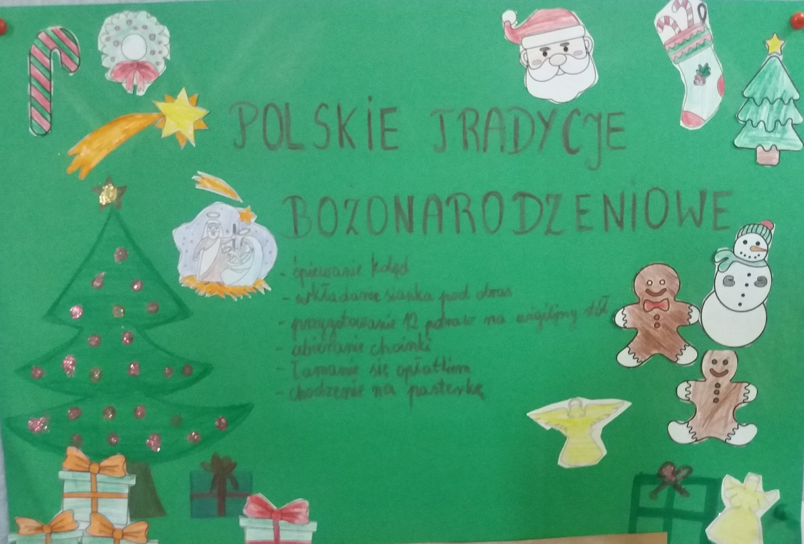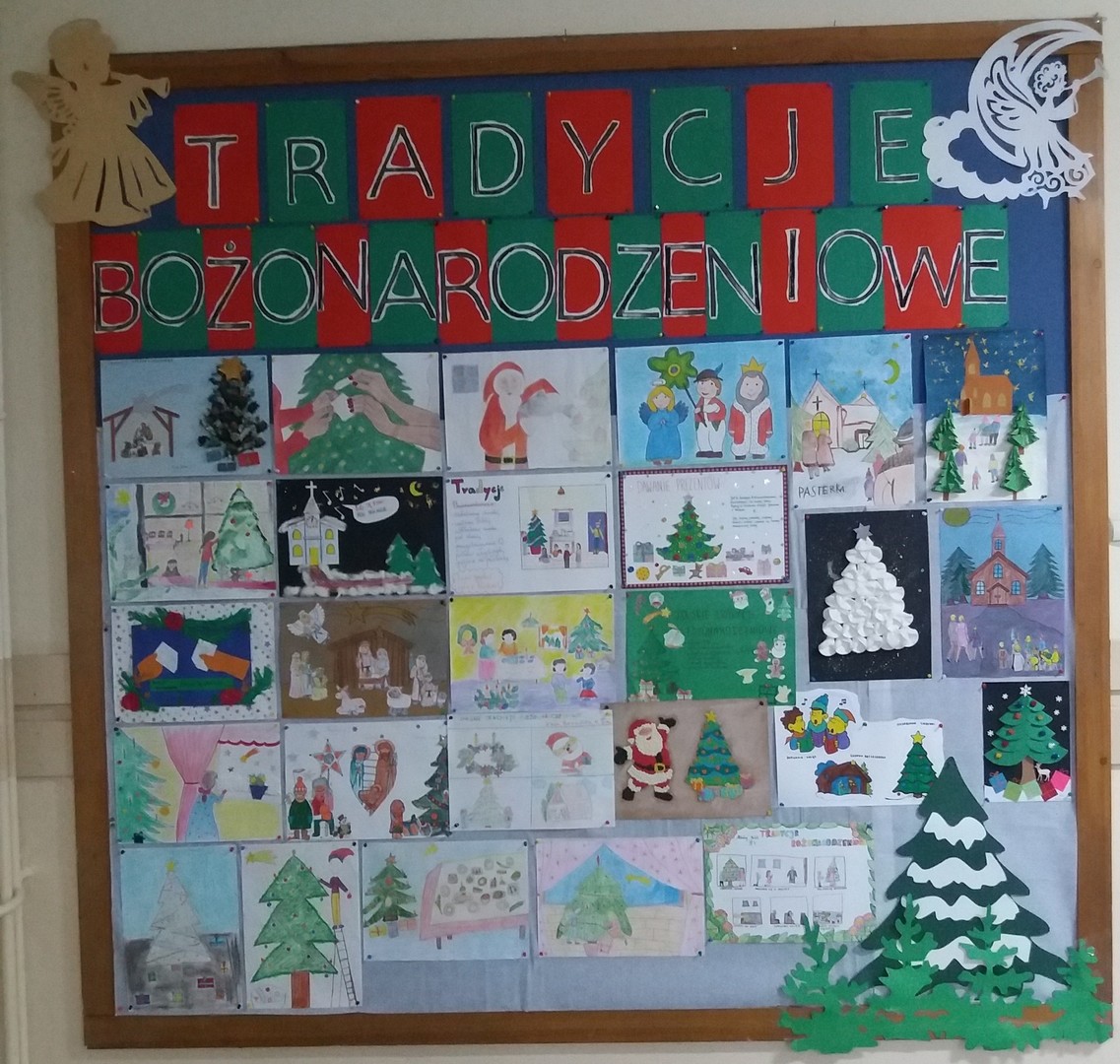 Uczniowie z klas 2-6 Sp1 wykonali piękne prace na świąteczną wystawę pt. "TRADYCJE BOŻONARODZENIOWE". Wszystkie prace możemy podziwiać na szkolnym korytarzu. Na wystawie nie zabrakło prac nawiązujących do kolędowania, dzielenia się opłatkiem, tworzenia szopek bożonarodzeniowych, Pasterki, dwunastu potraw na Wigilii, czy do obdarowywania się prezentami. Pojawił się również Święty Mikołaj, który przypomina nam o św. Mikołaju biskupie z Miry. Dziękujemy wszystkim uczniom za zaangażowanie w przygotowanie tej wystawy.