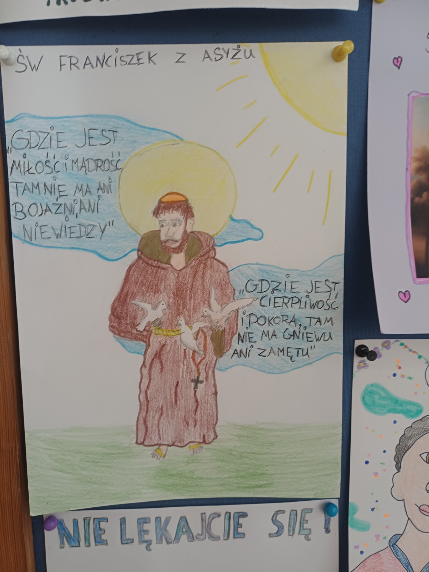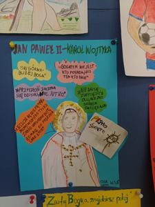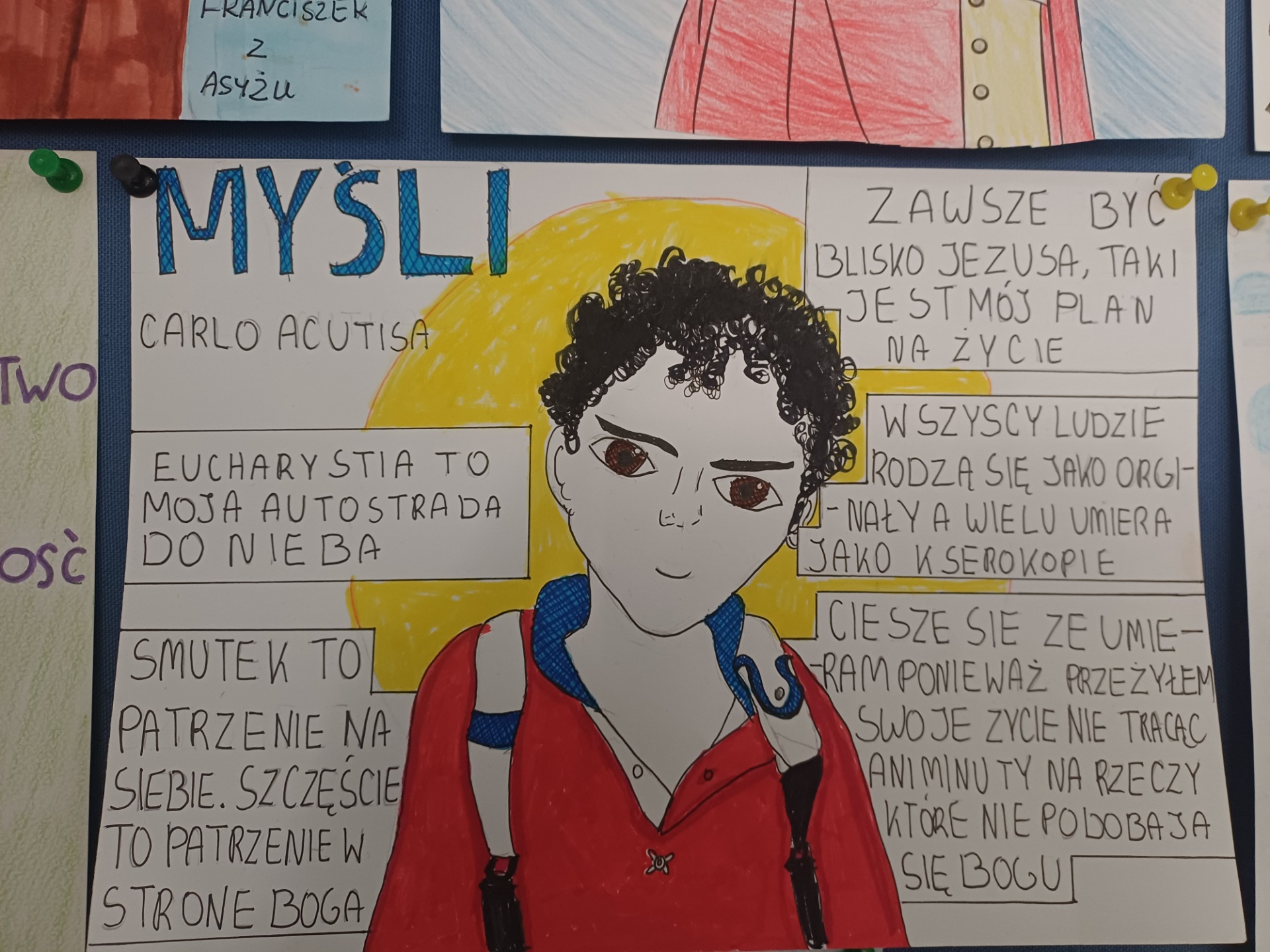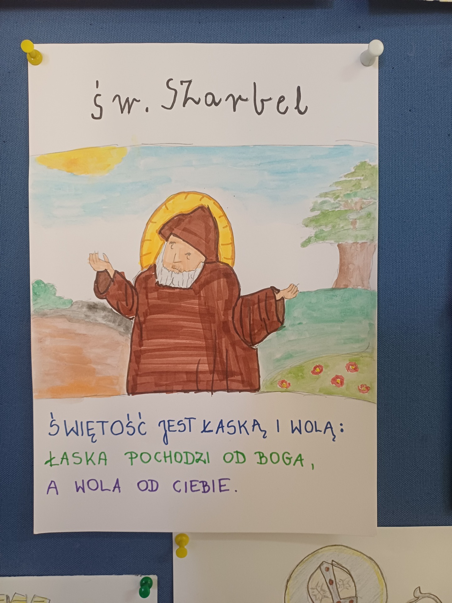 Wystawa „Myśli naszych Świętych” Na dolnym korytarzu naszej podstawówki możemy podziwiać wielu wspaniałych Świętych, którzy swoim życiem dają nam cenne wskazówki na drodze do świętości. Prace przygotowane przez uczniów klas III-VI. .
