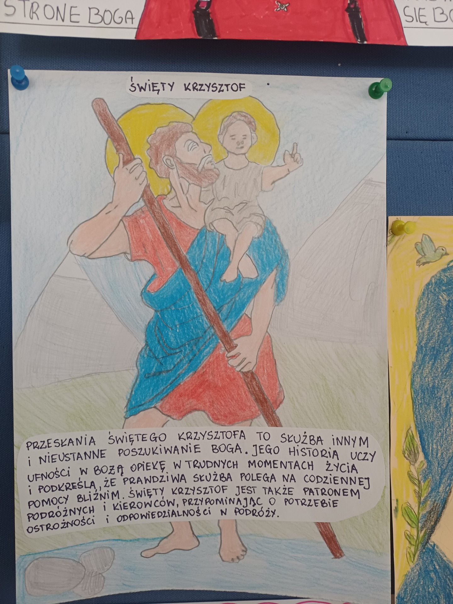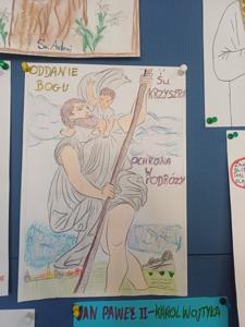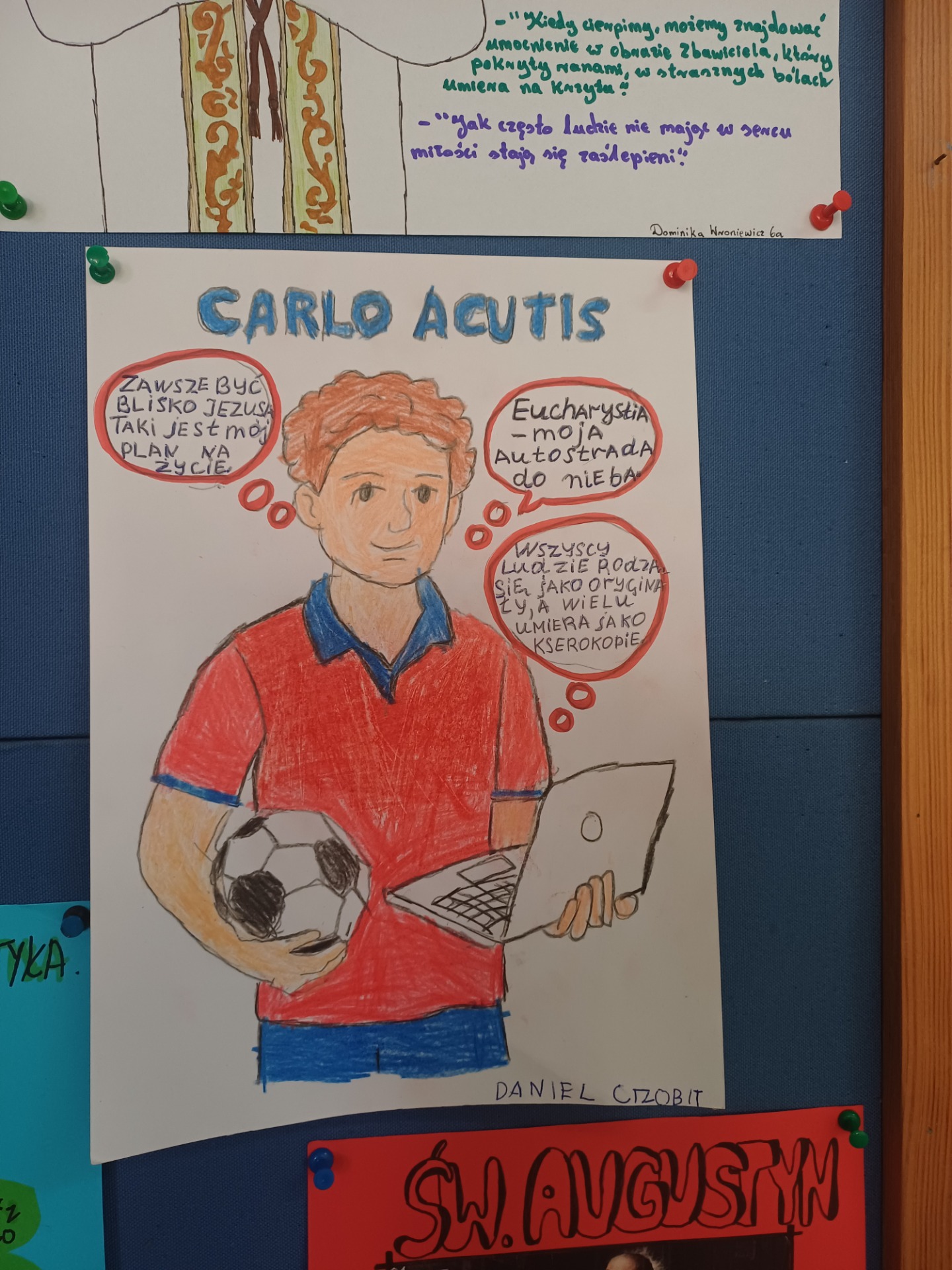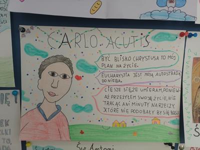 Wystawa „Myśli naszych Świętych” Na dolnym korytarzu naszej podstawówki możemy podziwiać wielu wspaniałych Świętych, którzy swoim życiem dają nam cenne wskazówki na drodze do świętości. Prace przygotowane przez uczniów klas III-VI. .