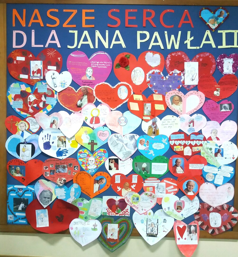 Jak co roku z okazji Dnia Papieskiego uczniowie klas 2—7 naszej podstawówki przygotowali przepiękną wystawę, aby upamiętnić św. Jana Pawła II. Wystawa „Nasze serca dla Jana Pawła II” przedstawia ponad pięćdziesiąt różnobarwnych serc, w których uczniowie dziękują papieżowi za jego wiarę, miłość i nadzieję, a także za naukę, jak po prostu być człowiekiem. Niewątpliwie wystawa poprzez bogate treścią serduszka nawiązuje do tegorocznego hasła Dnia Papieskiego „Cywilizacja życia”. Na sercach nie zabrakło ciekawych zdjęć ze św. Janem Pawłem II, a także jego złotych myśli, które sprawiają, że zatrzymujemy się, aby choć przez chwilę o nim pomyśleć… Niech to wspominanie wielkiego Polaka stanie się w naszej szkole coroczną ważną lekcją.