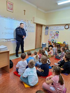5 stycznia w klasie 1 a i 1 b odbyło się spotkanie profilaktyczno - edukacyjne z funkcjonariuszem policji. Prelekcja miała na celu przedstawianie zawodu policjanta oraz omówienie bezpieczeństwa w trakcie ferii, szczególnie uprawiania sportów zimowych i zabaw na świeżym powietrzu. Policjant przestrzegał przed ślizganiem się na skutych lodem rzekach i stawach oraz ostrzegał przed zjeżdżaniem z górek znajdujących się blisko ulic i rzek. Funkcjonariusz udzielił wskazówek jak bezpiecznie bawić się na śniegu i jak zachowywać się na kuligu oraz przypomniał numer alarmowy służb ratunkowych. Przeprowadzone spotkanie zakończono się quizem z pytaniami, z którymi uczniowie świetnie sobie poradzili.